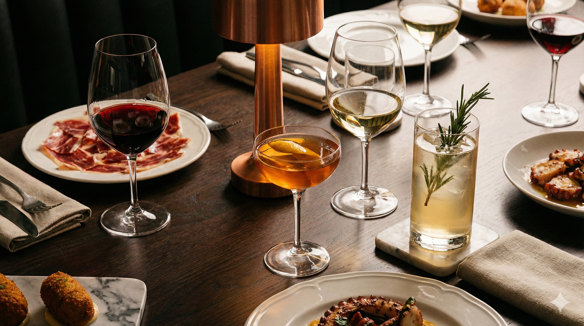 Tapas españolas premium en un ambiente elegante que evoluciona hacia copas y música.