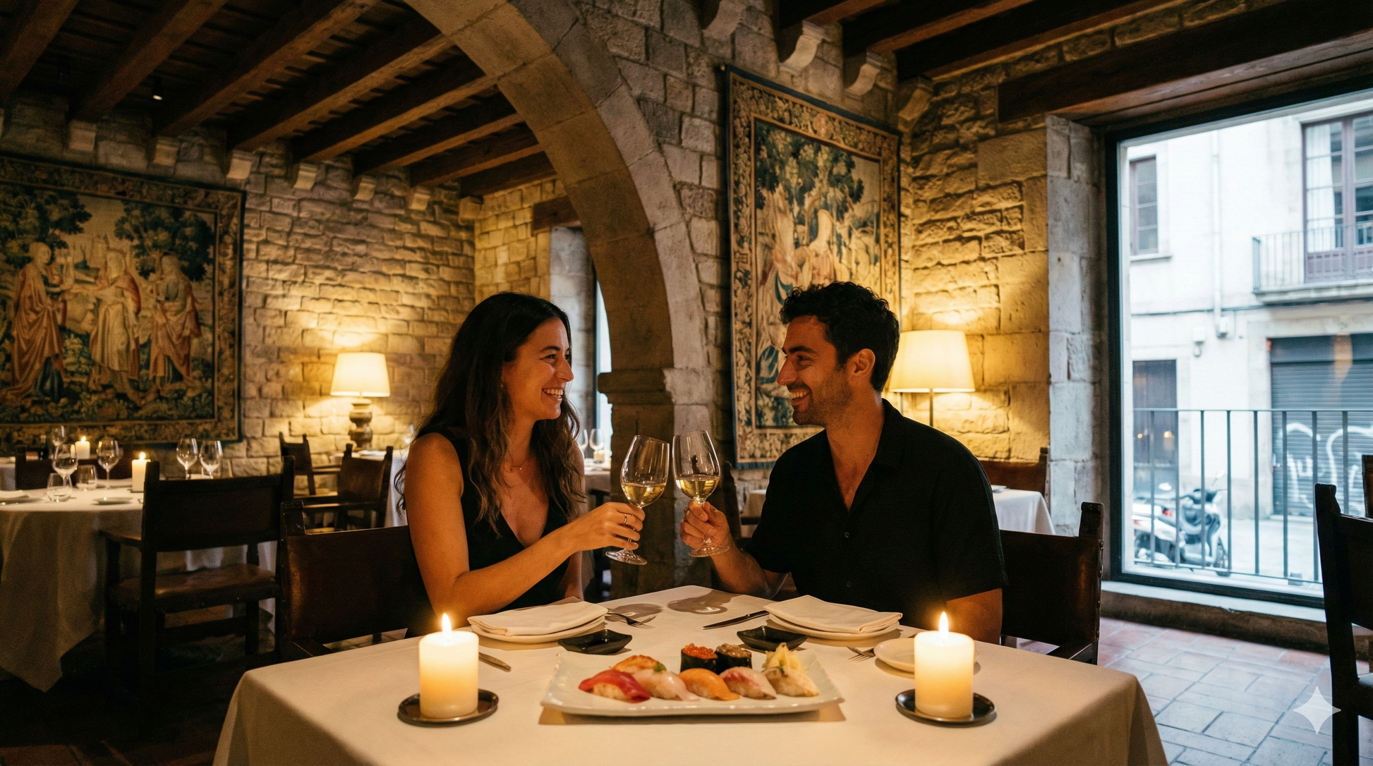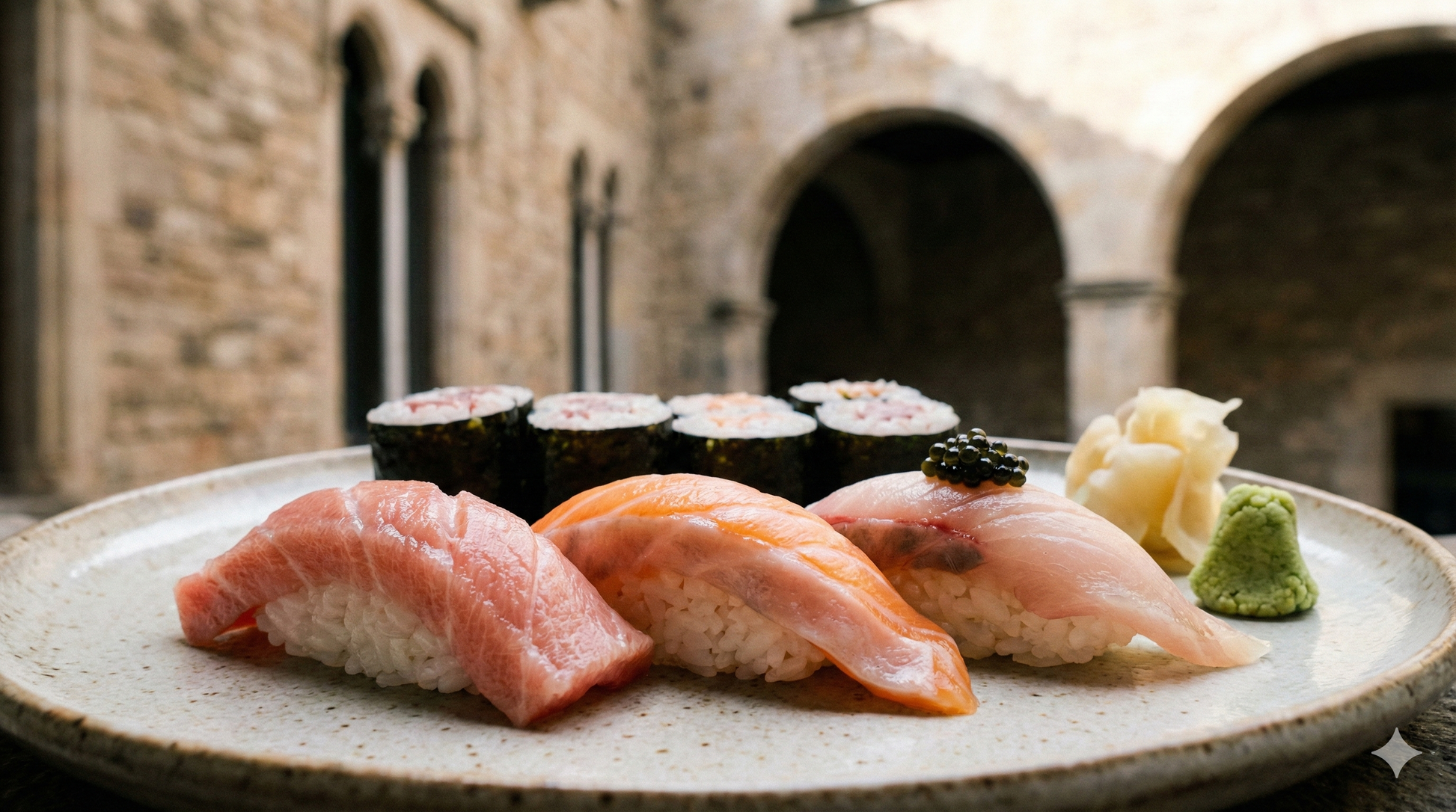Una cena íntima de cocina japonesa, principalmente sushi, en un entorno histórico singular en el corazón de Barcelona.